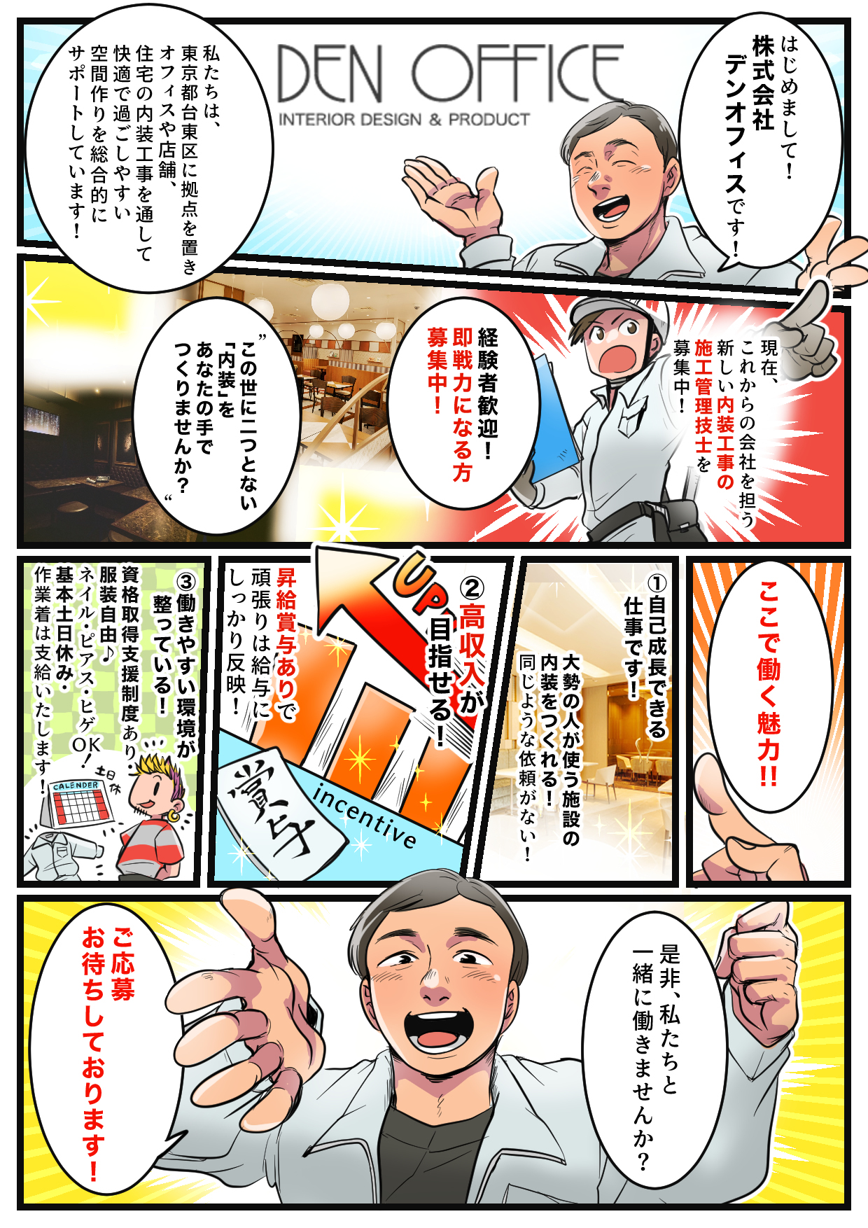 株式会社デンオフィスでは、確かな実績と丁寧な対応がお客様から高く評価され、現在も多くのご依頼をいただいております。手がける案件は、飲食店や商業施設、住宅、展示会ブース、イベント用ディスプレイなど多岐にわたります。 また、大手企業とも直接取引があり、今年から「特定建設業」を取得した事により、受注規模の拡大でこれまで許可の関係からお断りしていた案件も受注できる事になりましたので即戦力で活躍できる人材を募集しております!多彩な現場で経験を積みながら、着実にスキルアップできる環境です。